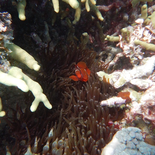 Bright red-brown anemonefish with three narrow white to grey bands on the head and body and a large rearward-facing spine on the gill cover running from the rear of the eye to the first white stripe. Males are 2-3 times smaller and more brightly coloured than females. Read more…