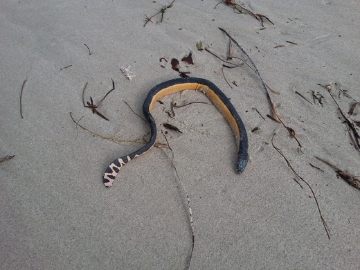 This sea snake was washed up onto the beach after a storm 8/07/14. It was still alive but only just. I found this snake 30m north of the Hillary's marina in Perth.