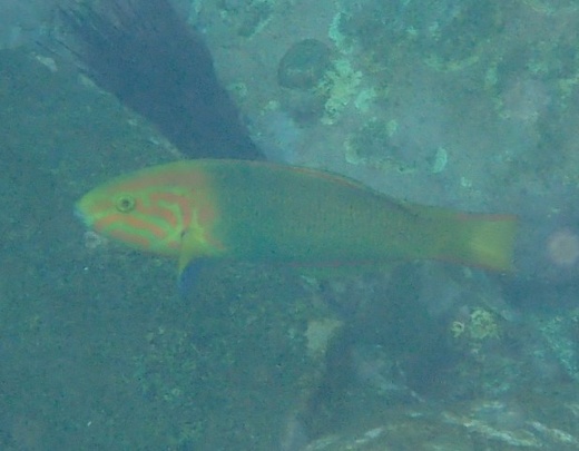 This fish undergoes many colouration alterations as it ages and changes sex from female to male. Juveniles have a yellowish brown body. As the fish grows a green band appears behind the head. Older juveniles change the body colour from yellow to green. The head stays yellow and gains irregular pink stripes. In adults, as the fish ages it undergoes a sex transition into male. Males develop a thick blue horizontal band around the centre of the body, behind the pectoral fins. Colours intensify on the head and fins areas. Pink edges appear on the fins. The pectoral fins turn a bright yellow and blue. The tail is moon shaped. Read more…
