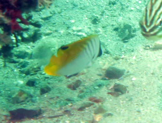 This fish has three unique distinguishing features; the black band that runs vertically across the eyes, the threadlike yellow filament extending from the soft dorsal fin, and the distinctive white, black and yellow banded markings on the body. These markings are white anteriorly and yellow posteriorly with intersecting perpendicular black lines. Read more…