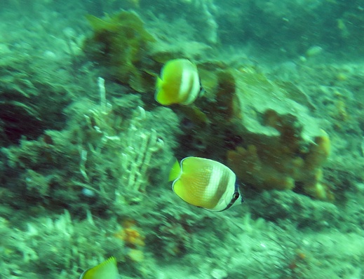 Two vertical white bars are present across the centre of the body. These bars are separated by a brown bar. The posterior of the fish is yellowish-brown. A black band crosses the eyes. Scales have light greyish-white portions which gives the fish a white spotted look. In adults a blue line is visible along rear dorsal, anal and caudal fin margins. Read more…