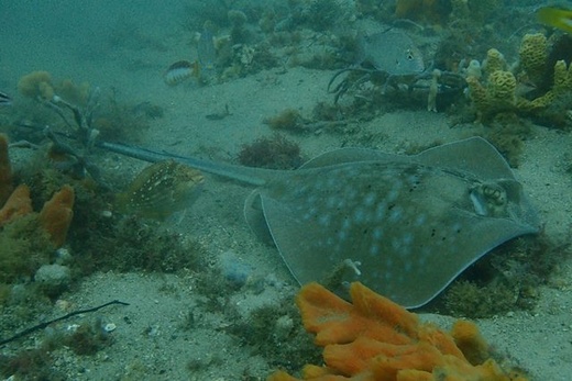 Dusky brown-grey oval shaped body with long thin tail. Blue spots adorn the upper body disc. Some individuals have dark shading beneath the eyes and on the brow ridge. Tail is grey-white with white banding along the tip, with spines originating from the middle upper surface. Read more…