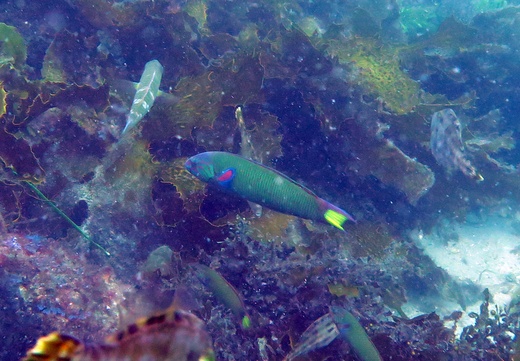 Juveniles have a greenish brown upper body with blue underside. Faint pink and purple irregular bands adorn the face. A black spot is found on the dorsal fin and another near the base of the tail. Caudal and anal fins are transparent. Adults have a green to blue body with bright pink bands in irregular patterns on the face. The caudal fin is yellow in the centre, darker on the edges and moon shaped. The pectoral fins are elongated, pink in the centre and fringed in blue. Scales have faint pink edges. Some individuals have pink markings along the dorsal fin tips. Read more…