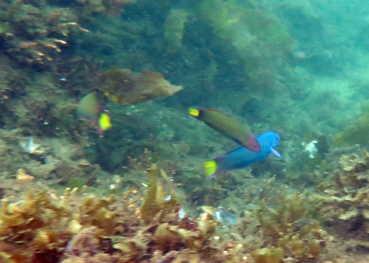 Juveniles have a greenish brown upper body with blue underside. Faint pink and purple irregular bands adorn the face. A black spot is found on the dorsal fin and another near the base of the tail. Caudal and anal fins are transparent. Adults have a green to blue body with bright pink bands in irregular patterns on the face. The caudal fin is yellow in the centre, darker on the edges and moon shaped. The pectoral fins are elongated, pink in the centre and fringed in blue. Scales have faint pink edges. Some individuals have pink markings along the dorsal fin tips. Read more…