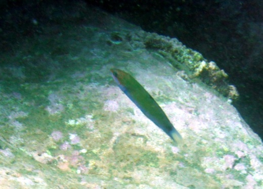 Juveniles have a greenish brown upper body with blue underside. Faint pink and purple irregular bands adorn the face. A black spot is found on the dorsal fin and another near the base of the tail. Caudal and anal fins are transparent. Adults have a green to blue body with bright pink bands in irregular patterns on the face. The caudal fin is yellow in the centre, darker on the edges and moon shaped. The pectoral fins are elongated, pink in the centre and fringed in blue. Scales have faint pink edges. Some individuals have pink markings along the dorsal fin tips. Read more…