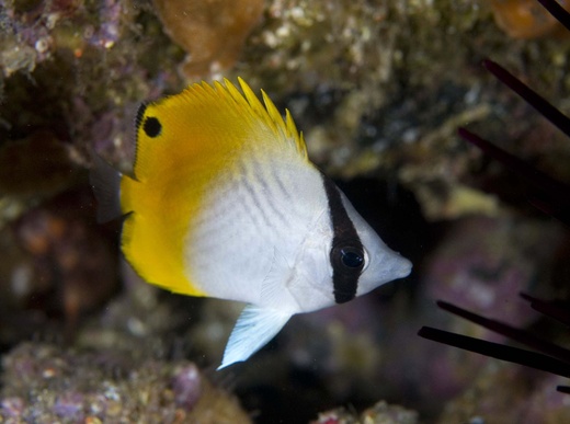 This fish has three unique distinguishing features; the black band that runs vertically across the eyes, the threadlike yellow filament extending from the soft dorsal fin, and the distinctive white, black and yellow banded markings on the body. These markings are white anteriorly and yellow posteriorly with intersecting perpendicular black lines. Read more…