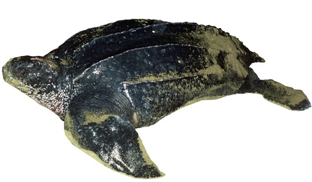 Leatherback turtles are named for their soft leathery shell, and are the largest sea turtle. Their black shell has 5 ridges running along the length with light spots on it. Hatchlings are black with white markings along carapace ridges and undersides.