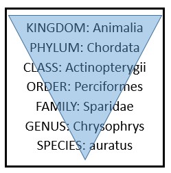 Figure 2 (right) shows the classification of animals. Kingdom is the broadest category (e.g. plants and animals are separate kingdoms). This means that every species has a classification for each level of the pyramid….and the more levels that are the same, the closer they are related. For the snapper example, the classification is below.