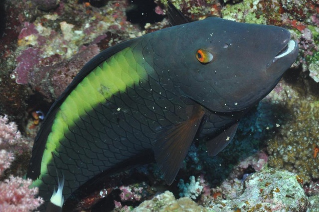 MARKINGS: spots/stripes etc. can be important. And although colour CAN be useful – it is often so variable that it’s not a deciding factor when identifying a fish – so probably not as useful as you might think. Fish can change colour within seconds, appear different when out of the water, with age, with gender, or with time of day (see images left for example of differences within one species). For many species, differences between juvenile and adult colouration are often so drastic that you might mistake them as different species. Many females and males are often strikingly different in colour and many fish exhibit what is called ‘night variation’ – where colours observed at night are different to that seen in the day.