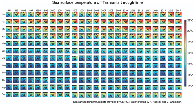 They say a picture is worth a thousand words. This is certainly the case for a new Redmap poster that maps changes in sea surface temperature off Tasmania over the past 24 years.