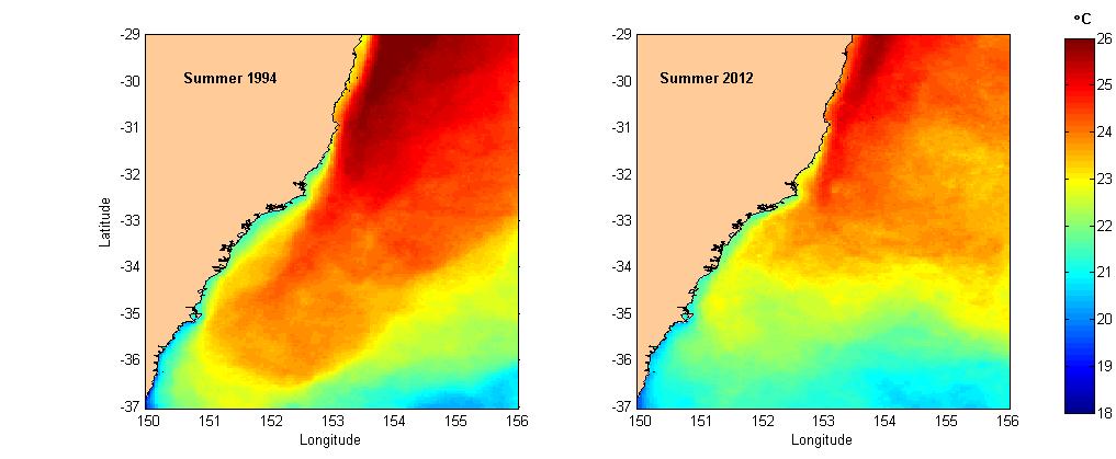 Left image: A summer on the NSW coast with a narrow current (1994). Right: A summer with a wide current and cooler waters flowing up from the south (2012)(Image: CSIRO).