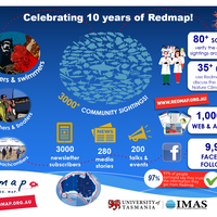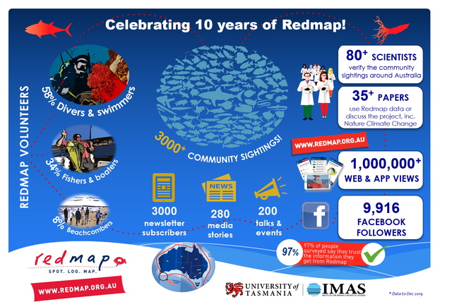 From humble beginnings in Tasmania in 2009, Redmap Australia has since grown into a successful national citizen science project monitoring changes in marine life across Australia. Click on the infographic to see what we've achieved over the past 10 years.
