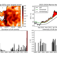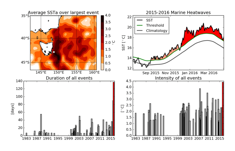 Anatomy of a marine heatwave. Top left: summer sea surface temperatures relative to seasonal average. Top right: ocean temperature over time; red shaded region shows the ongoing heatwave. Bottom panels: duration (left) and intensity (right) of all recorded heatwaves; the ongoing event is shown in red. Eric Oliver