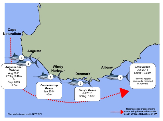 He said it could simply be a case of these tropical fish hitching a ride down the coast of Western Australia in the warm Leeuwin Current and then subsequently getting trapped within the colder than tolerable southern waters. According to Dr. Pepperell this is very plausible for larger pelagic fish like blue marlin.
