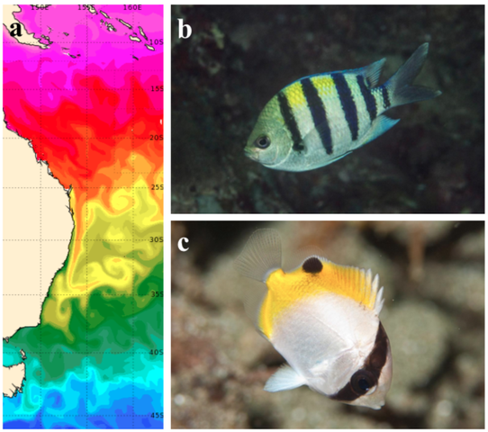The East Australia Current (EAC) transports warm tropical water southwards along the east coast of Australia (a). During the warmer months, the EAC extends as far as south-eastern Australia and brings with it a suite of tropical fishes including Indo-Pacific sergeant (Abudefduf vaigiensis) (b) and Threadfin butterflyfish (Chaetodon auriga) (c). These fishes are termed โvagrantsโ because they are moving outside of their typical geographic range and generally only survive in temperate ecosystems whilst the water is warm. SST map sourced from: www.bom.gov.au/oceanography/forecasts/idyoc300.shtml?region=Aus&forecast=SST, Abudefduf vaigiensis image sourced from: Mark Rosenstein / iNaturalist.org, Chaetodon auriga image sourced from: orangkucing / http://orangkucing.tumblr.com
