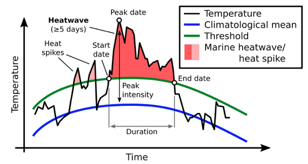 Marine heatwaves have recently been defined as “prolonged periods of unusually warm water at a particular location for that time of the year.” It’s important to note that marine heatwaves can occur at any time of the year, summer or winter, as their classification depended on the difference between the average temperature for a specific time of year and the observed temperature of the ocean.