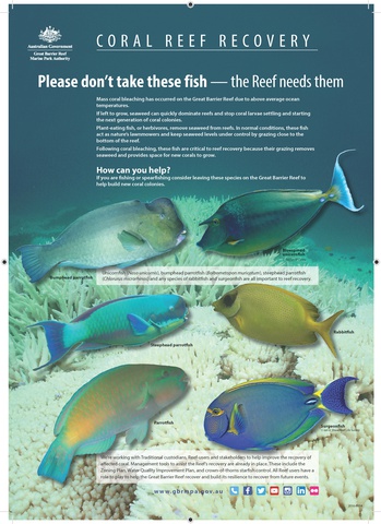 The Great Barrier Reef Marine Park Authority is asking fishers and spearfishers to help spread the word and consider leaving plant-eating fish on the Great Barrier Reef to help build new coral colonies following the mass coral bleaching event.