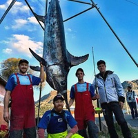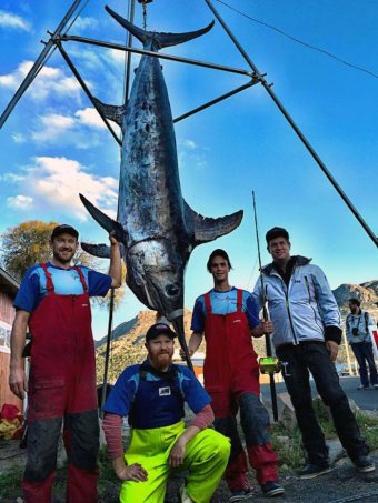Photo supplied by Leo Miller: Tasmanian teenager Kyle Longmore stands to the right of his 263 kilogram catch.