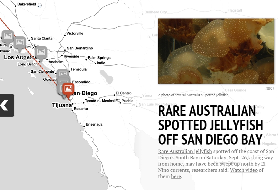 Warmer waters across the California coast have brought unprecedented sightings of marine animals along the shore and in the water. Larger fish and bigger schools of fish are staying around later in the year, and in some cases, species that have never before been documented in California have found their way to California shores. Read the full story at NBC 7 San Diego.