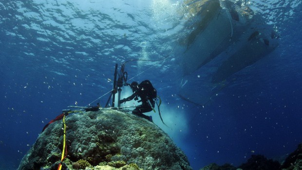 Scientists take core samples from giant coral on Ningaloo Reef. Photo: from WA Today