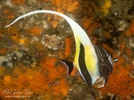 A Blacklip Butterflyfish, seen in a scattered group of 3-4 across a shallow reef.