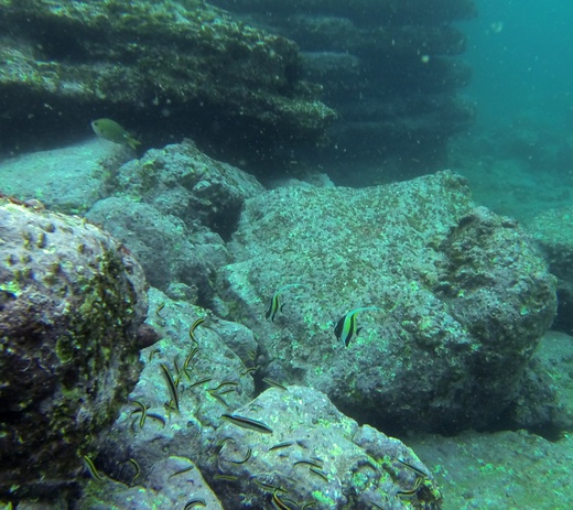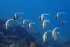 Distinctively shaped fish with a shield shaped body, pointed mouth and elongated dorsal fin. Colouration is also a distinguishing feature with black and white vertical bands across the body. A yellow area with faded edges is found in the centre of the body and towards the tail. A bright yellow to light orange marking crosses the tubular mouth. The elongated dorsal fin is white and decreases in relative length as the fish grows. Eyes are high on the face. In older fish lumps form above the eyes. Read more…