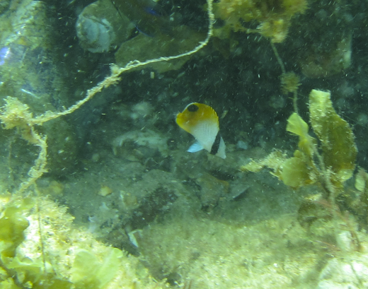 This fish has three unique distinguishing features; the black band that runs vertically across the eyes, the threadlike yellow filament extending from the soft dorsal fin, and the distinctive white, black and yellow banded markings on the body. These markings are white anteriorly and yellow posteriorly with intersecting perpendicular black lines. Read more…