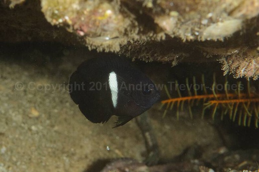Body is black with a vertical white "keyhole shaped" marking behind the head and pectoral fins on both sides.This marking is how the species obtained it's common name. Dorsal and anal fins are large and can overlap the caudal fin making the fish seem oval in shape. Anal fin is yellow along the margin. A thin blue line running along the posterior edges of the dorsal fin, the entire edge of the caudal fin and through the centre of the anal fin develops as the fish matures. Read more…