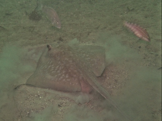 Dusky brown-grey oval shaped body with long thin tail. Blue spots adorn the upper body disc. Some individuals have dark shading beneath the eyes and on the brow ridge. Tail is grey-white with white banding along the tip, with spines originating from the middle upper surface. Read more…