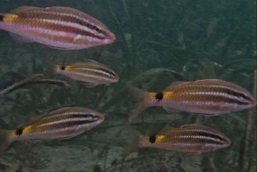 Alternating pale and dark stripes on head and body with dark spot on upper part of base of tail. Distinctive barbels under chin. Read more…