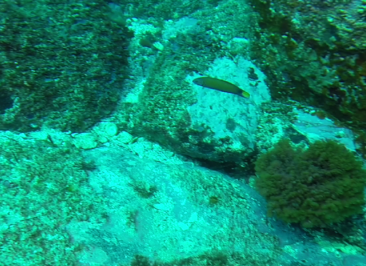 Juveniles have a greenish brown upper body with blue underside. Faint pink and purple irregular bands adorn the face. A black spot is found on the dorsal fin and another near the base of the tail. Caudal and anal fins are transparent. Adults have a green to blue body with bright pink bands in irregular patterns on the face. The caudal fin is yellow in the centre, darker on the edges and moon shaped. The pectoral fins are elongated, pink in the centre and fringed in blue. Scales have faint pink edges. Some individuals have pink markings along the dorsal fin tips. Read more…