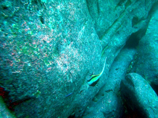 Distinctively shaped fish with a shield shaped body, pointed mouth and elongated dorsal fin. Colouration is also a distinguishing feature with black and white vertical bands across the body. A yellow area with faded edges is found in the centre of the body and towards the tail. A bright yellow to light orange marking crosses the tubular mouth. The elongated dorsal fin is white and decreases in relative length as the fish grows. Eyes are high on the face. In older fish lumps form above the eyes. Read more…