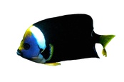 Juveniles have a black body and face with vertical white band running along the gills. A yellow bar is present on the top of the head between the eyes and the throat area has a yellow tinge. Caudal and pelvic fins are yellow with transparent edges. Pectoral fins are transparent. Adults have a black body with a blue face separated by a white vertical band behind the gills. The face has small yellow spots and yellow bands on the throat and running along the top surface between the eyes, which can be quite faint in some individuals. Caudal and pelvic fins are yellow. Adults have blue edges on the rear portion of the anal and dorsal fins. Read more…