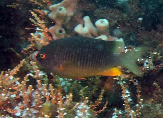 The body is generally brown on the upper surfaces and yellow on the lower areas and towards the head. Anal and pelvic fins are yellow. Tail fin is forked with rounded ends and yellowish brown in colour. The dorsal fin is brown with a vertical yellow band at the rear that fades into a translucent section. Scale edges have a brown mark on the trailing edge. These markings intersect to give the fish a thin diagonally banded look. Read more…