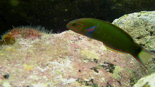 Juveniles have a greenish brown upper body with blue underside. Faint pink and purple irregular bands adorn the face. A black spot is found on the dorsal fin and another near the base of the tail. Caudal and anal fins are transparent. Adults have a green to blue body with bright pink bands in irregular patterns on the face. The caudal fin is yellow in the centre, darker on the edges and moon shaped. The pectoral fins are elongated, pink in the centre and fringed in blue. Scales have faint pink edges. Some individuals have pink markings along the dorsal fin tips. Read more…