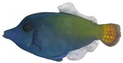 The body can vary in colour, most commonly have a bright blue front fading into a green posterior. The tail is bright orange with light to dark patterns around the edging. A dark spot is present laterally between the eye and pelvic fins. The dorsal fin has evolved into a large spine protruding above the head at will. Read more…