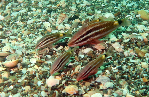 Alternating pale and dark stripes on head and body with dark spot on upper part of base of tail. Distinctive barbels under chin. Read more…