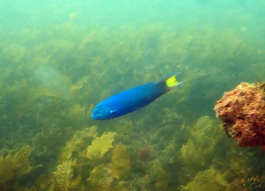 Juveniles have a greenish brown upper body with blue underside. Faint pink and purple irregular bands adorn the face. A black spot is found on the dorsal fin and another near the base of the tail. Caudal and anal fins are transparent. Adults have a green to blue body with bright pink bands in irregular patterns on the face. The caudal fin is yellow in the centre, darker on the edges and moon shaped. The pectoral fins are elongated, pink in the centre and fringed in blue. Scales have faint pink edges. Some individuals have pink markings along the dorsal fin tips. Read more…