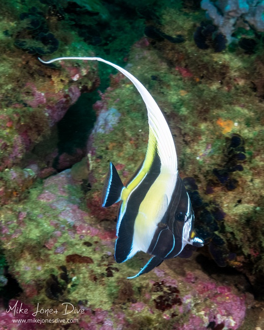 Distinctively shaped fish with a shield shaped body, pointed mouth and elongated dorsal fin. Colouration is also a distinguishing feature with black and white vertical bands across the body. A yellow area with faded edges is found in the centre of the body and towards the tail. A bright yellow to light orange marking crosses the tubular mouth. The elongated dorsal fin is white and decreases in relative length as the fish grows. Eyes are high on the face. In older fish lumps form above the eyes. Read more…