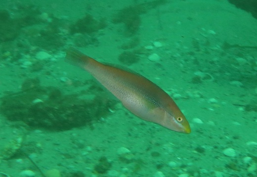 The brokenline wrasse undergoes colouration changes as it grows, matures and changes sex. It transitions through two phases – initial (females) and terminal (transition between female and male). Juveniles have a pinkish-grey upper body with a white belly. A thick horizontal black line running along the body from the mouth, through the eye and to the tail separates the upper and lower body colours. A thin blue line begins to form underneath the eye. All fins are transparent. Fish in the initial phase are predominantly pink with a white belly. The black line from the juvenile phase has become less bold and been replaced with a flecked blue and black line. The snout section is yellow. The lower portion of the body may have faint black spots. Read more…