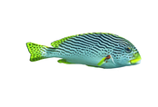 Pale grey body with long oblique black bands along face and back. Fins are bright yellow with dorsal, caudal and anal fins covered in black spots. Pectoral and pelvic fins have a red anterior blotch. Read more…