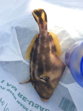 Meuschenia freycineti (6-spine leather jacket (female)) Caught a fish in Wallaroo Jetty. Don't know the species. Tweet Weight 0.300kg