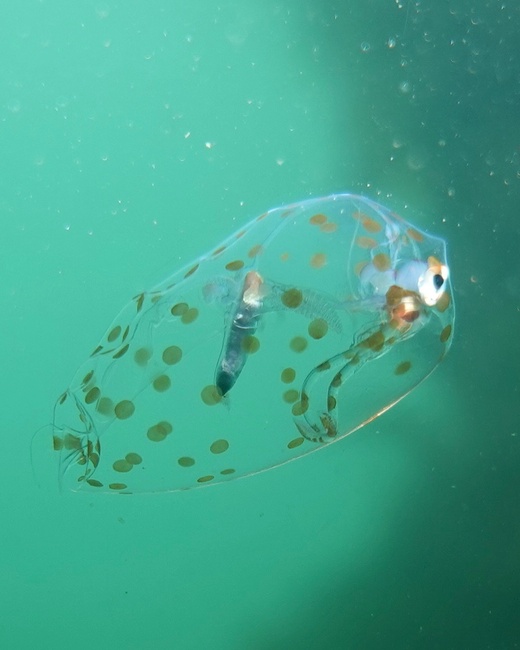 This Glass Squid, only a few centimetres in length, is hard to tell apart from a lone salp! When feeling exposed, they pull their tentacles inside themselves, as pictured.