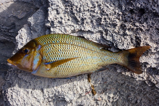 Body colour is golden bronze. Contains blue spots on the upper surface of the body and there are blue bars or lines which radiate from the eyes over the cheeks and snout. Read more…