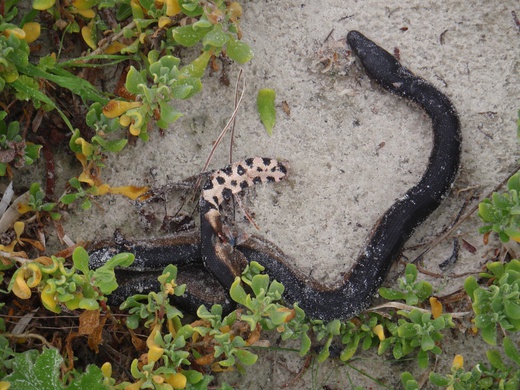 Moderately slender snake up to about 80 cm. Black head and black back, lower surfaces yellow or brown, tail pale yellow. Read more…