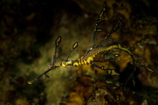 These relatives of seahorses have distinctive leaf-like appendages protruding from a few parts of the brown-red body. The body has longitudinal blue bars on parts of the body, small yellow spots on the body and head, and white spots on the snout. Males brood red eggs on the underside of the tail. Males brood red eggs on the underside of the tail. Read more…
