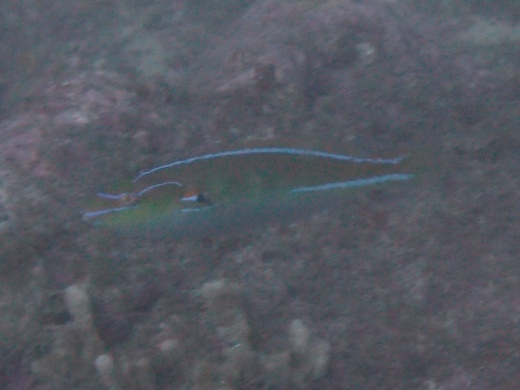 The brokenline wrasse undergoes colouration changes as it grows, matures and changes sex. It transitions through two phases – initial (females) and terminal (transition between female and male). Juveniles have a pinkish-grey upper body with a white belly. A thick horizontal black line running along the body from the mouth, through the eye and to the tail separates the upper and lower body colours. A thin blue line begins to form underneath the eye. All fins are transparent. Fish in the initial phase are predominantly pink with a white belly. The black line from the juvenile phase has become less bold and been replaced with a flecked blue and black line. The snout section is yellow. The lower portion of the body may have faint black spots. Read more…