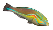 The redspot wrasse changes in colouration as it grows, matures and changes sex. It transitions through two phases – initial (females) and terminal (transition between female and male). In the adult phase the fish changes sex to male and the colouration is altered. The body is brownish green on the upper half and light blue to white on the lower half. Four thin, wavy iridescent blue lines begin at the mouth and behind the eye and run horizontally along the body. The orange spot at the base of the transparent pectoral fin in the initial phase darkens to be a deeper red. The cheeks are faint yellow. Read more…