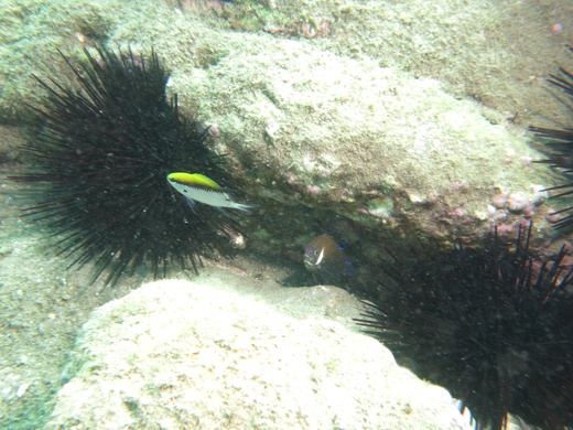 White body with a diagonal black band from mouth, through eye and to end of dorsal fin. Colouration above this black band is yellowish brown. Caudal fin has black upper and lower edges. Anal fin is transparent with a black lower edge. Can be found in large spawning aggregations. Read more…
