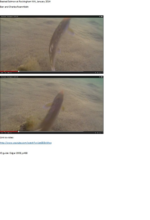 http://www.youtube.com/watch?v=Uet855lcMws Fir identification, the Beaked Salmon is best viewed in the YouTube video using the link provided. The video can be paused at intervals between the 42 and 46 second marks. That way all features can be viewed as required- as the startled fish exits its hiding place in front of the camera. Identification using Edgar 2008, p468
